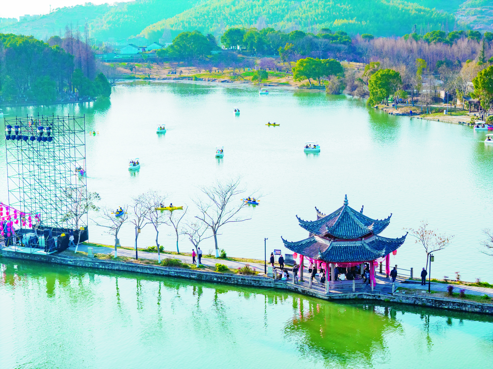 近日,浙江宁波市江北区慈城古县城的慈湖游船项目悄然走红,成为年轻人“奔县游”“反向游”的热门选择。阳光洒落湖面,一艘艘公园游船载着游客穿行于湖光山色之中,碧绿的湖水如镜,倒映着四周苍翠的青山,岸上始建于清代的师古亭,飞檐翘角倒映水面,与游船相映成趣,共同勾勒出一幅宁静悠然的江南画卷。在这里,时光仿佛慢了下来,游客们乘船慢游,在“舟行碧波上,人在画中游”的惬意中感受“江南第一古县城”的独特魅力,唤醒都市人对诗意生活的向往。